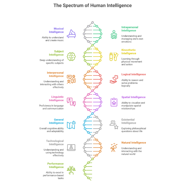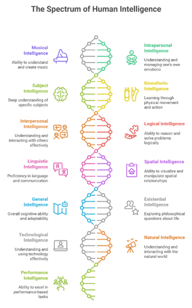 Children master 13 intelligences, from logic, language, and creativity to empathy, nature care, and technology.